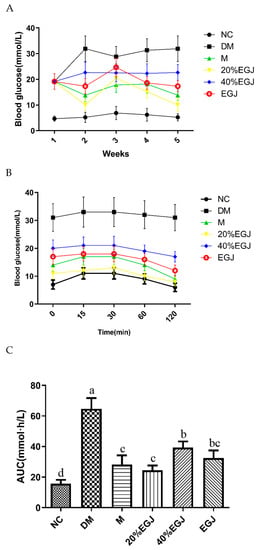As shown in Figure 10A, during the period of administration, the level of the FBG in the NC group was basically stable at the normal level (≤7.8 mmol/L). Compared to the NC group, the FBG in the other groups were significantly higher. The FBG in the DM group was the highest, indicating that the hyperglycemia symptoms were the most severe [27]. In the M group, the level of the FBG reached the highest level in the first week, and then decreased, indicating that the metformin could restore the FBG of the T2DM to fluctuate within the normal range. There was no significant difference between the 20% EGJ group and the EGJ, for which the FBG levels were separately 11.06 ± 2.62 and 17.33 ± 2.25 mmol/L at the fifth week. However, the 40% EGJ group did not show a significant downward trend. These results indicated that the metformin, 20% EGJ (geniposide), and EGJ could effectively alleviate the level of the FBG in the T2DM mice.