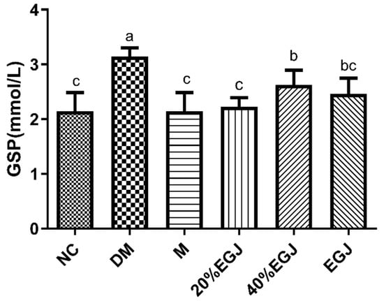 GSP of the mice in each group. Note: the data were expressed as the mean ± the SD (n = 9) and the different letters marked above the bars showed the significant differences (p < 0.05).