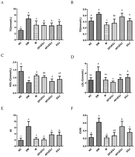 (A–F) stands for the TC, TG, HDL-C, LDL-C, AI, and CVRI of the mice in each group, respectively. Note: the data were expressed as the mean ± the SD (n = 9) and the different letters marked above the bars showed the significant differences (p < 0.05).