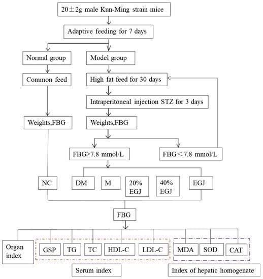 According to the adaptive feeding situation and the weight of the mice, nine mice were chosen as the normal control group and continued to be fed using an ordinary diet. The other mice were fed using a high-fat diet [24]. Each group consisted of nine mice. Four weeks later, the mice in the high-fat diet group were intraperitoneally injected with streptozotocin (STZ, 65 mg kg−1bw−1) for three consecutive days [6]. Then, the mice continued to be fed using a high-fat diet for one week. The fasting blood glucose levels of the mice were measured after fasting for 12 h. The group with a fasting blood glucose value ≥ 7.8 mmol/L could be regarded as the successful T2DM mice. They were divided into a normal control group (NC group), a T2DM group (DM group), a metformin positive control group (M group, 200 mg kg−1), a 20% EGJ group (100 mg kg−1), a 40% EGJ group (200 mg kg−1), and an EGJ group (600 mg kg−1). The mice in each group were fed for 5 weeks. The flow diagram of the animal experiments is shown in Scheme 1.
