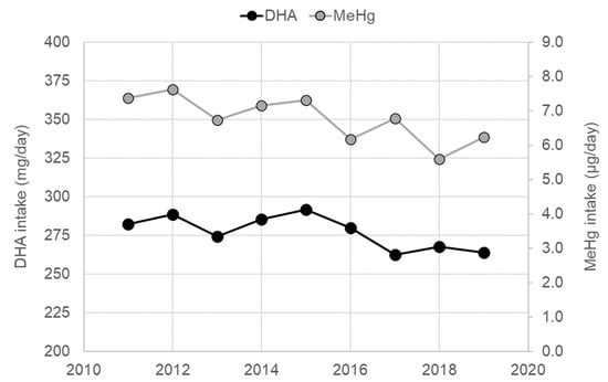 The average DHA and MeHg contents of seafood of the 13 categories were obtained by averaging the DHA and MeHg contents of fish and shellfish species belonging to each of the categories. Daily intakes of DHA (mg/day) and MeHg (μg Hg/day) of women of childbearing age in 2011–2019 were calculated by multiplying the average contents of DHA (mg/g) and MeHg (μg Hg/g) by daily consumption for each of the 13 seafood categories (g/day) (see Table S1 for reference), and by summing them all. Calculation was limited to 2011–2019 because data on sex and age divided by the 13-category seafood consumption are available only from 2011 in the NHNS reports. Seafood consumption of women of age 20–29 and 30–39 were averaged and regarded as seafood consumption of women of childbearing age in this study, which is regarded as an approximation of the seafood consumption of pregnant Japanese women because statistics of pregnant women are limited in the NHNS data.