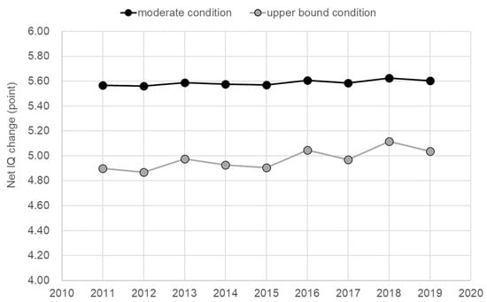 Based on the estimated maternal daily intakes of DHA and MeHg, the net IQ change of offspring for each year was calculated by Equation (1). The net IQ change denotes gain/loss of IQ from the infant IQ attained when no seafood was consumed by the mother. In Figure 2, two series of plots are shown: one was calculated by using the center value of the regression slope between hair Hg and IQ (−0.18) (designated “moderate condition” hereafter), and the other was by using upper bound estimate (−0.7) (designated “upper bound condition”) in Equation (1). The calculated net IQ change during 2011–2019 was +5.6 ± 0.02 under the moderate condition and +5.0 ± 0.1 under the upper-bound condition. The net IQ was constantly on the positive side for both conditions, which meant that the seafood intake of the Japanese women of childbearing age resulted in the IQ gain of offspring, and the between-year variation of the net IQ change was small. Under the upper bound condition, net IQ change, i.e., IQ gain, seems to increase as seafood consumption decreases. This trend was not apparent by visual inspection of Figure 2 when the moderate condition is assumed.