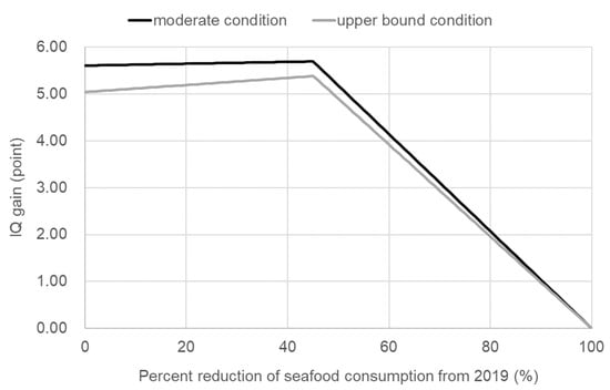 As shown in Figure S1, a steady decrease in seafood consumption by the general Japanese population started in the mid-1990s. This steady decrease was also the case with women of childbearing age. The IQ gain of infants born to women of childbearing age did not apparently vary when the moderate condition is assumed (regression slope −0.18 in Equation (1)), or even an increasing IQ gain was observed when the upper bound condition was assumed (regression slope −0.7 in Equation (1)) (Figure 2): this means that the decreasing trend in seafood consumption of Japanese women of childbearing age can have even a beneficial effect for infant IQ gain. The latest IQ gain estimate is more than the estimate of 2011 by 0.02 or 0.14 points. If we assume that seafood consumption of women of childbearing age is 75% of that of general Japanese (mean of 1999–2019), the net IQ change of infants at the maximum seafood consumption in 1997 (98.2 g/day) is estimated to be 5.48 and 4.55 points for moderate and upper bound conditions, respectively: the estimated IQ gain at 2019 (5.60 and 5.04) is greater by 0.12 and 0.49 points for the moderate and upper bound condition, respectively, than that at the greatest seafood consumption. This trend of increasing IQ gain while decreasing seafood consumption is due to the fact that seafood consumption by Japanese women is still sufficiently abundant to give beneficial effects on infant IQ. The FAO/WHO assumed that regression between DHA intake and IQ was not linear across the full DHA intake range, but saturation takes place: 5.8 points was the estimated upper limit of IQ gain, which is based on Oken et al. [16]. This means that IQ increase takes place until DHA intake reaches 145 mg/day, when the regression slope 0.04 in Equation (1) is considered, but no further increase is expected when the intake exceeds this level. The estimated DHA intake from seafood was around 280 mg/day for Japanese women of childbearing age during the last 10 years. Therefore, a decrease of seafood consumption only had a decreasing adverse effect on infant IQ from maternal MeHg intake, in other words, a decrease of seafood consumption of the Japanese women of childbearing age so far has had a beneficial effect on infant IQ.