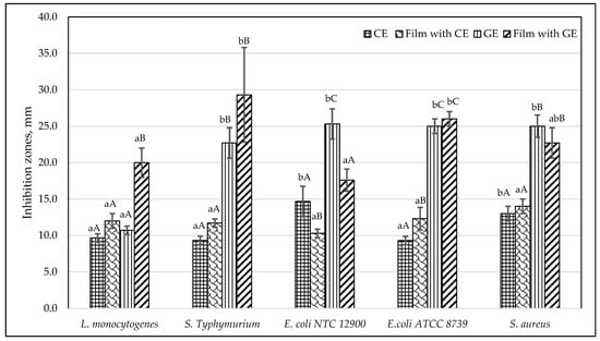 Antimicrobial activities of alginate/pectin films with CE and GE against tested microorganisms. The columns are drawn from the average of at least three independent experiments. Error bars denote ± one standard deviation; small letters indicate significant (p < 0.05) differences between bacteria sensitivity to tested alginate/pectin films and extracts; uppercase letters indicate significant (p < 0.05) differences between alginate/pectin films and extracts.
