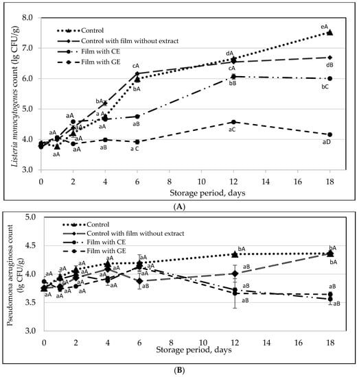 Effect of alginate/pectin film with CE and GE on the growth of L. monocytogenes (A) and P. aeruginosa (B) of herring fillets during storage for 18 days. The curves are drawn from the average of at least three independent experiments. Error bars denote ± one standard deviation. Different characters (a, b, c, d, e) indicate significant (p < 0.05) differences between storage duration, and A, B, C, D indicate significant (p < 0.05) differences between the films. Note: So far as the CFU measurements were not continuous, the lines cannot be used for estimating the precise number of CFU at any storage period between the points.