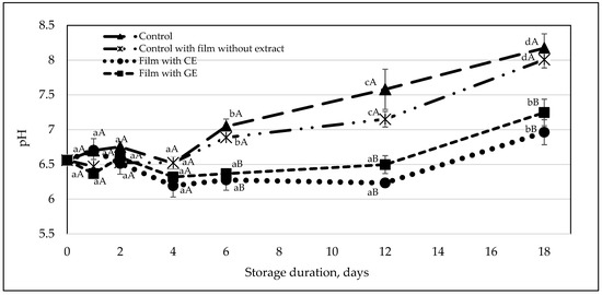 Effect of alginate/pectin film with CE and GE on pH of herring fillets during storage for 18 days. The curves are drawn from the average of at least three independent experiments. Error bars denote ± one standard deviation. Different characters (a, b, c, d) indicate significant (p < 0.05) differences between storage duration, and A, B indicate significant (p < 0.05) differences between the films.