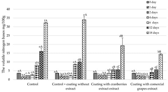 Effect of alginate/pectin film with CE and GE on the total volatile basic nitrogen in herring fillets during storage for 18 days. The columns are drawn from the average of at least three independent experiments. Error bars denote ± one standard deviation. Different characters (a, b, c, d, e, f) indicate significant (p < 0.05) differences between storage duration, and A, B, C indicate significant (p < 0.05) differences between the films.