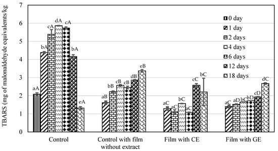 Effect of alginate/pectin film with CE and GE on TBARS in herring fillets during storage for 18 days. The columns are drawn from the average of at least three independent experiments. Error bars denote ± one standard deviation. Different characters (a, b, c, d, e) indicate significant (p < 0.05) differences between storage duration, and A, B, C, D indicate significant (p < 0.05) differences between the films.