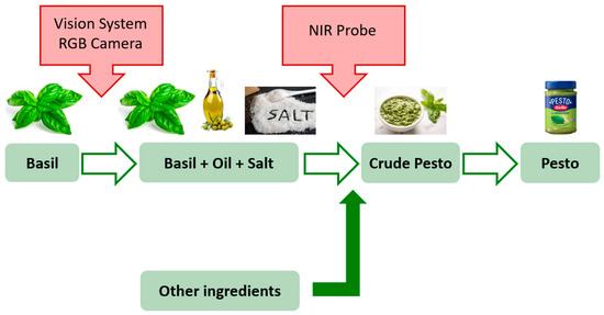 After this step, basil was mixed with salt and oil, forming an intermediate product, which was monitored on-line by a NIR probe. Then, all the other ingredients of the sauce were added to the intermediate product to complete the production and obtain the final product, whose quality was assessed by off-line laboratory analyses. A schematic representation of the process is reported in Figure 1. A critical issue when modeling on-line data for a continuous process is to establish the process timeline to match the sensors data acquired at different time steps with the same material; in other words, the considered variables should refer to the same sample to assemble a row of the data matrix. In this case, this step revealed particularly challenging, since the mixing of the intermediate product with the other ingredients (taking place after the NIR probe) was achieved in three distinct mixers that were emptied, transferring the crude pesto to the following processing steps sequentially, ensuring a continuous material flux. Thus, the residence time was established with the experts at the plant in order to correctly match the NIR spectra, corresponding to the intermediate material with the finished pesto at the end of the line, on which the quality parameters were acquired.