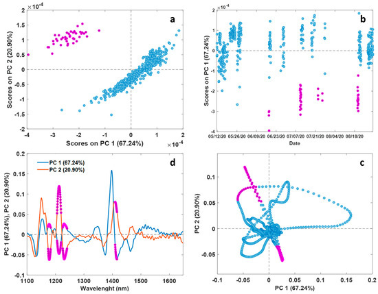 Results of the Exploratory Data Analysis performed on NIR data. PC1 vs. PC2 Scores plot (a), Scores on PC1 as a function of time (b), Loadings on PC1 and PC2 as a function of time (c), and Loadings on PC1 vs. PC2 (d). In (a,b), purple points represent anomalous samples; in (c,d), purple points represent wavelengths that mainly depict the difference of anomalous samples from the other ones.