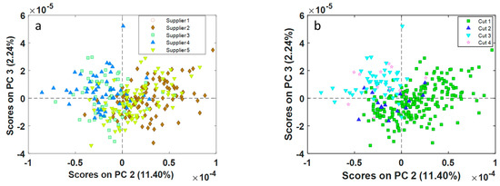 Results of the Exploratory Data Analysis performed on NIR data. PC2 vs. PC3 scores plots colored by different suppliers (a) and cuts (b).