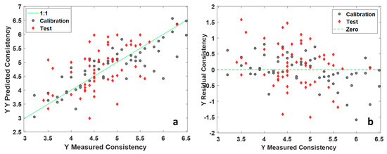PLS results on NIR data for consistency. Predicted vs. measured values plot (a), residuals vs. measured values plot (b).