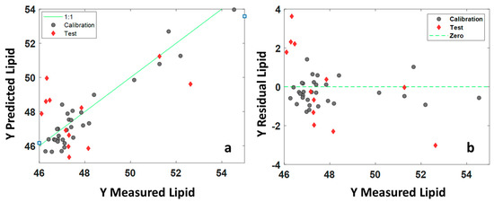 The prediction model of total lipids content was built using a lower number of samples than the previous model, as this parameter was assessed less frequently than consistency. In this case, 5 LVs were selected according to the minimum RMSECV (venetian blind, 10 splits) for the model’s construction. As shown in Figure 6a, the majority of the samples had a lipid content included in the range 46–49%, and only a few samples presented higher values. This is a quite common situation in real time production, where a consistent quality of the product is pursued. In this case, a couple of samples in the test set were predicted with a higher error but, in general, the error values comprised the 2% range, which the company considered acceptable for controlling if the product was within specification for this parameter. One of the two samples with a high lipid content in the test set was predicted accurately, whereas the other one was underestimated (Figure 6b).
