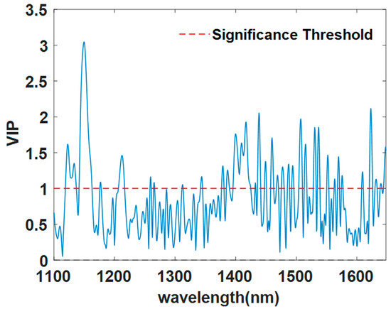 In Figure 7, the Variable Influence in Projection (VIP) scores are shown [32], which highlight that the band at 1166 nm, ascribable to the olive oil’s second overtone of the CH stretching of CH3 [30,31], is the most influent for the prediction of total lipids content. Moreover, other bands linked to lipids in olive oil [30,31] can be found at 1422 and 1461 nm, typical of the CH stretching and deformation of CH2, both above the significance threshold [32].