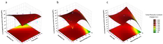 Response surface plots showing combined effects of process variables for TPC (mg GAE/g d.w.): amplitude (%)—time (min) (a), amplitude (%)—% EtOH (b) and % EtOH—time (min) (c).