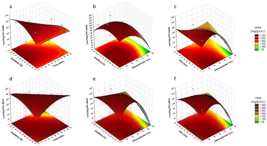 Response surface plots showing combined effects of process variables for DPPH and FRAP (mg TE/g d.w.): amplitude—time (min) (a,d), amplitude—% EtOH (b,e) and % EtOH—time (min) (c,f).