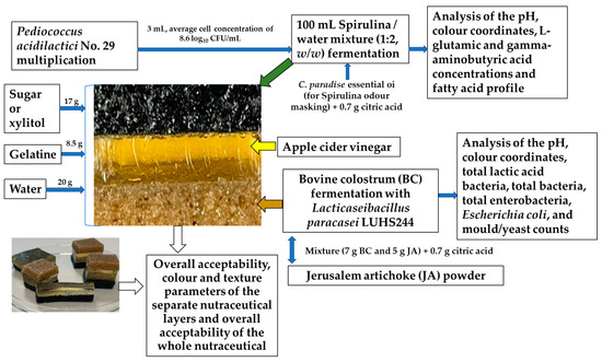 Therefore, the main purpose of this experiment was to develop a multifunctional nutraceutical composition based on ingredients of different origins (Spirulina powder, bovine colostrum, Jerusalem artichoke powder, and apple cider vinegar) that possess different health benefits through their different mechanisms of action. In order to improve the functional properties of Spirulina and bovine colostrum, fermentation with Pediococcus acidilactici No. 29 and Lacticaseibacillus paracasei LUHS244 strains, respectively, was carried out. These LAB strains were chosen due to their good antimicrobial properties, which were analysed in our previous work [31]. The following parameters were analysed: for Spirulina (non-treated and fermented)—pH, colour coordinates, fatty acid profile, and contents of L-glutamic and GABA acids; for bovine colostrum (non-treated and fermented)—pH, colour coordinates, dry matter, and microbiological parameters (total LAB, total bacteria, total enterobacteria, Escherichia coli, and mould/yeast counts); for produced nutraceuticals—the hardness, colour coordinates, and overall acceptability.