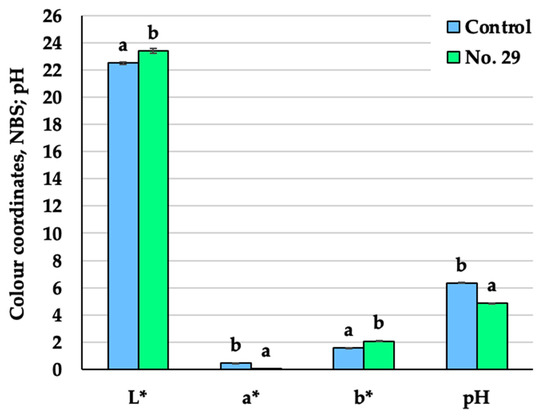 Changes in the pH values and colour coordinates in the Spirulina samples (Control—Spirulina powder and water mixture, 1:2 w/w; No. 29—Spirulina samples fermented for 24 h with Pediococcus acidilactici, strain No. 29; L*—lightness; a*—redness or—a*—greenness; b*—yellowness or—b*—blueness; NBS—National Bureau of Standards units. Data are represented as means (n = 6) ± standard error. a–b mean values denoted with different letters indicate significantly different values between the samples (p ≤ 0.05)).