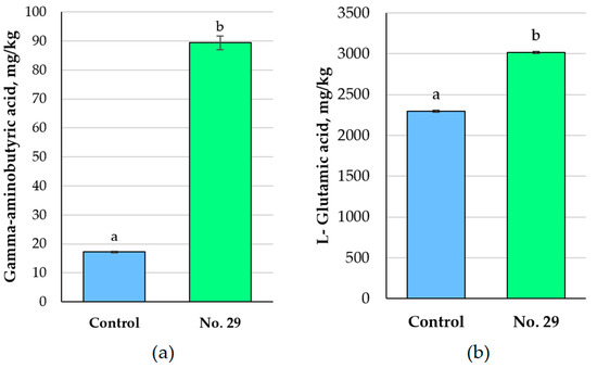 Concentrations of gamma-aminobutyric acid (GABA) (a) and L-Glutamic acid (L-Glu) (b) in the Spirulina samples (Control—Spirulina powder and water mixture, 1:2 w/w; No. 29—Spirulina samples fermented with Pediococcus acidilactici, strain No. 29, for 24 h. Data are represented as means (n = 6) ± standard error. a–b mean values denoted with different letters indicate significantly different values between the samples (p ≤ 0.05)).