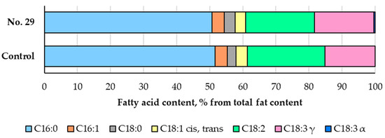 Fatty acid (FA) profile in the Spirulina samples (Control—Spirulina powder and water mixture, 1:2 w/w; No. 29—Spirulina samples fermented for 24 h with Pediococcus acidilactici, strain No. 29; C16:0—palmitic acid; C16:1—palmitoleic acid; C18:0—stearic acid; C18:1 cis- and trans-9-oleic acid; C18:2—linoleic acid; C18:3γ—gamma-linolenic acid; C18:3α—alfa linolenic acid. Data are represented as means (n = 6) ± standard error. a–b mean values denoted with different letters indicate significantly different values between the samples (p ≤ 0.05)).