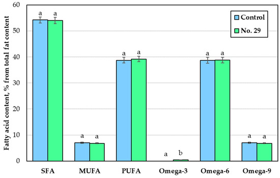 Classification of fatty acids (FA) in the Spirulina samples (Control—Spirulina powder and water mixture, 1:2 w/w; No. 29—Spirulina samples fermented for 24 h with Pediococcus acidilactici, strain No. 29; SFAs—saturated fatty acids; MUFAs—monounsaturated fatty acids; PUFAs—polyunsaturated fatty acids; omega 3—omega 3 fatty acids; omega 6—omega 6 fatty acids; omega 9—omega 9 fatty acids; Data are represented as means (n = 6) ± standard error. a–b mean values denoted with different letters, indicates significantly different values between the samples (p ≤ 0.05)).