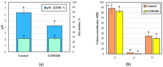 Bovine colostrum (a) pH and dry matter (DM), (b) colour coordinates (L*—lightness; a*—redness or −a*—greenness; b*—yellowness or −b*—blueness). Control—non-treated bovine colostrum; LUHS244—bovine colostrum fermented with Lacticaseibacillus paracasei LUHS244; NBS—National Bureau of Standards units; DM—dry matter. Data are represented as means (n = 3) ± standard error. a–b mean values within a line with different letters are significantly different (p ≤ 0.05).