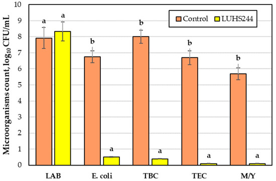 Bovine colostrum microbiological parameters. LAB—lactic acid bacteria; E. coli—Escherichia coli; TBC—total bacteria count; TEC—total enterobacteria count, M/Y—mould and yeast, Control—non-treated bovine colostrum, LUHS244—bovine colostrum fermented with Lacticaseibacillus paracasei LUHS244. Data are represented as means (n = 3) ± standard error; a–b mean values within a line with different letters are significantly different (p ≤ 0.05).