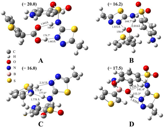 Optimized 3D complex structures between sulfamethizole and (A) 3-thiopheneacetic acid, (B) 3-thiopheneethanol, (C) 3-thiophenemethylamine, and (D) 3-thiopheneboronic acid. The presence of hydrogen bonds is indicated by the light black dashed lines. The values near the hydrogen bonds are the bond lengths and bond angles, and values in brackets are binding energies; unit: kcal/mol. Level of theory: PWPB95(D3-BJ)/def2-QZVPP//B97-3c.
