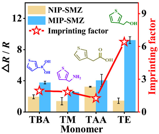 EIS responses (bar charts) and imprinting factors (line charts) of several MIPs prepared with different monomers towards target sulfamethizole (SMZ, 0.1 μM).