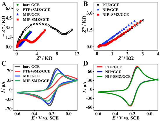 Figure 3C,D shows the CV curves of different modified electrodes as discussed above. Clear redox peaks were found in the CV curves of the bare GCE (Figure 3C, gray line) and PTE/GCE (Figure 3D, red line). After the electro-copolymerization, the PTE + SMZ/GCE (Figure 3C, red line) showed a significant increase in peak potential difference (ΔEp) and an obvious decrease in the peak current (Ip) compared with that of the PTE/GCE. The result confirmed the successful doping of the SMZ template in the polymer matrices. When the SMZ was eluted, the redox peaks of the formed MIP/GCE (Figure 3C, blue line) were more symmetrical and the currents were much higher than the PTE + SMZ/GCE before elution. This is because the MIP film has more conductive sites and more [Fe(CN)4]3−/4− permeation channels for electrochemical redox [35,36,37]. After rebinding of SMZ (Figure 3C, green line), the ΔEp and Ip again increased and decreased compared with that of the MIP/GCE. In contrast, the CV curve of the NIP-SMZ/GCE (Figure 3D, green line) showed no difference from that of the NIP/GCE (Figure 3D, blue line). The above CV variation tendency is consistent with that of the EIS, and both demonstrate the successful preparation of the MIP film and its effective recognition toward the analyte SMZ.