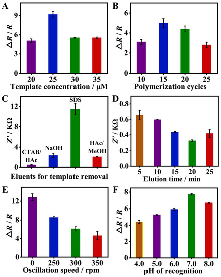 Optimization of experimental conditions, including template concentration (A), polymerization cycles (B), eluents and elution time for template removal (C,D), and oscillation speed and pH during recognition (E,F), to obtain a better sensing performance toward SMZ. Firstly, the eluent was optimized and determined by polymerization of 10 cycles at a concentration of 35 μM SMZ. Then, the concentration of SMZ was optimized in the case of polymerization of 10 cycles. Finally, the number of polymerization cycles was optimized at a template concentration of 25 μM. The rest are optimized in turn.