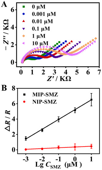 As shown in Figure 5A, with an increase in SMZ concentration from 0.001 to 10 μM, the impedance of the modified electrodes gradually increased. This is because the captured SMZ molecules partially blocked the electron transfer between the [Fe(CN)6]3−/4− redox probe and the electrode surface, and increased the film impedance. Meanwhile, in a concentration ranging from 0.001 to 10 μM, the EIS response varied linearly with the logarithm concentration of SMZ (Figure 5B). The linear regression equation for this sensor was expressed as ∆R/R = 1.27lgC + 5.23 (R2 = 0.999). The LOD was calculated as 0.18 nM according to the 3σ/S rule (σ is the standard deviation of the blank sample (n = 10), and S is the slope of the calibration curve). In contrast, the EIS response of the NIP/GCE increased very slightly with the SMZ concentration. The results again confirmed the excellent recognition capability of the MIP toward SMZ. The LOD of the proposed sensor is lower or comparable to most previous MIP-based electrochemical sensors for detecting SAs antibiotics (Table S1) [42,43,44]. In contrast to the listed sensors that perform signal amplification through various nanomaterials with long-time and laborious synthesis processes, the fabrication of the MIP sensing interface in this study is much faster, and more eco-friendly, and can be completed within 30 min without use of any toxic organic solvents.
