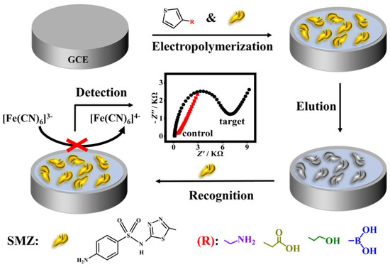 Herein, polythiophene derivatives, having the advantages of high environmental stability and good water solubility [26], were chosen as the polymer matrices for imprinting SMZ as a model of SAs. To establish hydrogen bond interaction between the SMZ template and the monomer, four kinds of thiophene substituted at the 3-position by different functional groups including carboxylic acid, amino, boric acid, and hydroxyl group were rationally chosen as monomer candidates. The quantum chemical calculation was first performed to analyze the interactions between the SMZ molecule and several monomers. Subsequently, experiments were carried out to assess the recognition effect of the four imprinted polymers based on the imprinting factor (IF), and 3-thiopheneethanol was eventually used. On this basis, a conductive molecularly imprinted polymer film-based impedimetric sensor was developed for simple, rapid, sensitive, and low-cost determination of SMZ. As shown in Scheme 1, the MIP film was in situ deposited on a glassy carbon electrode (GCE) surface by one-step electro-copolymerization of the SMZ template and one of the four 3-substituted thiophene monomers followed by elution of the template. The as-synthesized MIP films with specific imprinted sites that are complementary with SMZ in size, shape, and functionality are expected to selectively recognize SMZ. Upon rebinding with the non-conductive SMZ, the electron transfer between the electrode surface and the [Fe(CN)6]3−/4− redox probe in the electrolyte solution was blocked, resulting in a significant increase in film impedance. In this way, the target SMZ could be quantified according to the impedance change. The processes of imprinting and recognition were characterized by electrochemical impedance spectrum (EIS) and cyclic voltammetry (CV). A series of experimental parameters affecting the MIP preparation and its recognition were investigated and optimized. Under optimized conditions, the sensor showed good performances with a wide linear range, a low determination limit as well as excellent selectivity, reusability, and stability. In addition, the sensor had good applicability in spiked water and milk samples. Compared to most reported MIP-based electrochemical sensors for detecting SA antibiotics [27,28,29], this assay is more convenient, rapid, and sensitive, with a comparable or even lower limit of detection (LOD, 0.18 nM), and a much quicker preparation process (<30 min) for the sensing interface.
