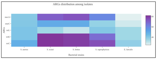 Heatmap representing ARG distribution among Staphylococcus spp. identified in the present scientific investigation.