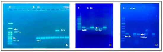 Electrophoresis gels (agarose 1.0 and 1.5%) in which it is possible to observe nitid positive amplicons and amplification results. (A) tetC (580 bp) and tetL (1077 bp); (B) tetK (382 bp); (C) poxtA (533 bp). Loading wells: S: DNA ladder 1 Kb (Genetic® FastGene 100–10,000 bp DNA Marker, Düren, Germany); K−: negative control and K+: positive control.