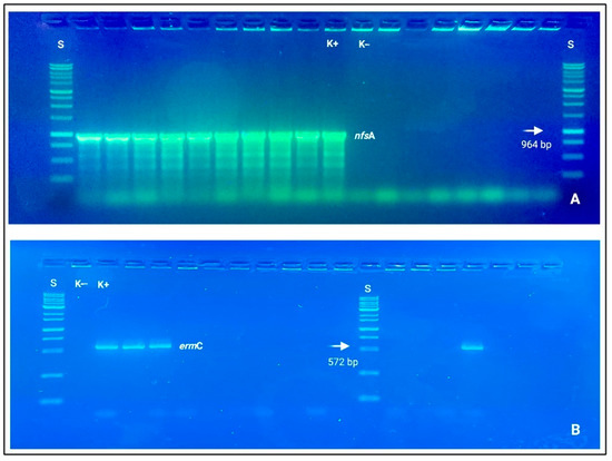 Electrophoresis gels (agarose 1.0%), in which it is possible to observe nitid positive amplicons and amplification results. (A) nfsA (964 bp); (B) ermC (572 bp). Loading wells: S: DNA ladder 1 Kb (Genetic® FastGene 100–10,000 bp DNA Marker, Düren, Germany); K−: negative control and K+: positive control.
