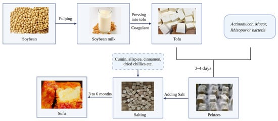 Sufu, also known as fermented soybean curd, moldy soybean curd or milk soybean curd, is a traditional Chinese fermented soybean product. This product is enjoyed by the majority of consumers due to its special texture, valuable nutrition and delicious flavor [,]. According to the fermentation strains, sufu can be divided into two types: inoculated fermentation sufu (inoculated with Actinomucor, Mucor, Rhizopus or bacteria) and natural fermentation sufu []. The basic processing procedure for sufu has remained almost unchanged for hundreds of years [,,]. Soybean is used as the main raw material and undergoes complex physical, chemical and biochemical processes. Preparation mainly includes two steps (Figure 1): (1) preparation of tofu: soybeans are soaked and expanded and then ground, bean dregs are removed to obtain soybean milk and coagulant is added to the cooked soybean milk; (2) preparation of sufu: the mold or bacteria are inoculated on the tofu, and after culturing for 3–4 days, salting is carried out, and then auxiliary ingredients (Cumin, allspice, cinnamon, dried chilies, salt, etc.) are added and fermented for 3 to 6 months.