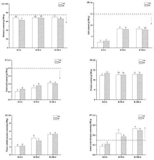 Contents of moisture (A), salt (B), total acid (C), protein (D), water-soluble protein (E) and amino acid nitrogen (F) in natural and inoculated fermented sufu. Note: Different lower-case letters indicated significant differences at p < 0.05. NF: natural fermentation; IF: inoculated fermentation. The dotted line is the standard requirement for each indicator of mature vegetarian curd; the arrow facing up indicates that mature vegetarian curd needs to be greater than the value; the arrow facing down indicates that mature vegetarian curd should be less than the value.