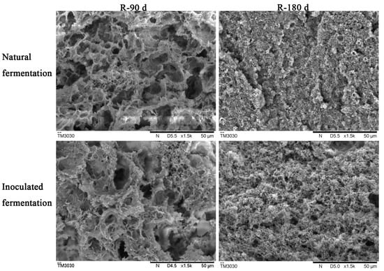 The microstructure of natural and inoculated fermented sufu at 90 and 180 days post-fermentation was observed using SEM (Figure 3). With the increase of fermentation time, the internal diameter of both types of sufu gradually decreased, and the internal structure became smooth, which was consistent with previous reports [,]. This may be related to protein hydrolysis. After 90 days post-fermentation, the interior of sufu had a network structure with more large pores, which may be due to the low degree of protein hydrolysis. The colloidal particles of protein were large and the damage to the protein gel structure was limited. After 180 days post-fermentation, both types of sufu had a significantly smaller pore size and were denser and more uniform than at 90 days, which may be related to the greater degree of hydrolysis of protein. At the same fermentation time, the internal gel pore size of naturally fermented sufu was slightly smaller than that of inoculated fermented sufu, indicating that the degree of protein hydrolysis in naturally fermented sufu was slightly higher, which was consistent with data in Table 1.