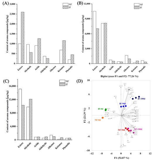 Comparison of aroma compounds between natural and inoculated fermented sufu at 0 d (A), 90 d (B) and 180 d (C) of fermentation and PCA analysis (D). NF: natural fermentation; IF: inoculated fermentation. Note: ES1: ethyl octanoate; ES2: ethyl palmitate; ES3: ethyl linoleate; ES4: ethyl acetate; ES5: 5−2−phenylethyl propionate; ES6: 14,17−octadecyl methyl dienoate; ES7: ethyl lactate; ES8: methyl 9,12,15−octadecatrienoate; ES9: ethyl benzoate; ES10: ethyl myristate; ES11: linalyl acetate; ES12: gamma nonalactone; ES13: ethyl phenylacetate; ES14: isoamyl acetate; ES15: methyl salicylate; ES16: ethyl elaidate; AL1: linalool; AL2: ethanol; AL3: isoamyl alcohol; AL4−: terpene alcohol; AL5: 1-pentanol; AL6: terpineol; AL7:2−nonylalcohol;AL8:trans−3−(4−hydroxy−3−methoxylphenyl)−2−propen−1−ol;AL9:cis−A,α−5−trimethyl−5−vinyltetrahydrofuran−2−methanol; AL10: nerol; AL11: 2,4−decadien−1−ol; AL12: benzyl alcohol; AL13: phenethyl alcohol; AC1: stearic acid; AC2: palmitic acid; AC3: octanoic acid; AC4: caproic acid; AC5: 4−methylvalericacid;AD1:benzene formaldehyde;AD2: (9ci)−2,6,6−trimethyl−1,4−cyclohexadiene−1−carboxaldehyde; AD3: phenylacetaldehyde; AD4: eicosanal; AD5: 2−hexane alkenal; AE1: limonene; AE2: ocimene; AE3: myrcene; AE4: cypressene; KT1: thujone; KT2: 2−nonanone; KT3: 3−octanone; HCl: methylcyclopentane; HC2: 2−methoxy−4−methylphenol; HC3: 2,3−dihydrobenzofuran; and HC4: indole.