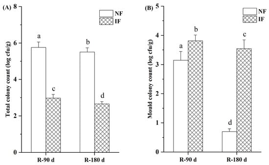 The total colony count (A) and mold colony count (B) in natural and inoculated fermented sufu at 90 and 180 d of fermentation. Note: Different lower-case letters indicated significant differences at p < 0.05. NF: natural fermentation; IF: inoculated fermentation.