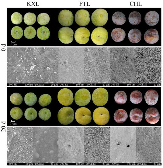 Changes in fruit appearance and cuticular wax structure among three plum cultivars during storage at room temperature. Note: the size of 300 SE was lenticels, and the size of 2.00 k SE was pericarp wax structure.