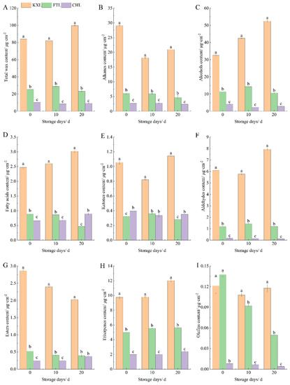 The total wax content in the epidermis of KXL, FTL and CHL was 83.96, 25.50 and 10.20 μg·cm−2, respectively, when harvested. The pattern of total wax changes of KXL was similar to CHL, as it decreased first and then increased during storage; however, it was different from FTL, which increased first and then decreased (Figure 2A). After storage for 20 d at room temperature, the total amounts of wax reached 99.67 (KXL), 23.35 (FTL) and 9.37 μg·cm−2 (CHL) and increased by 18.71% for KXL and decreased by 8.46% and 8.20% for FTL and CHL. Compared with KXL, the fluctuation of the wax amount in FTL and CHL changed more slightly.