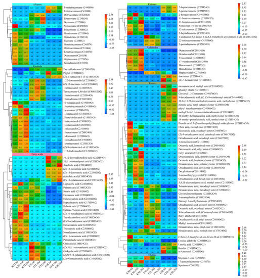 The content of esters decreased significantly for KXL and FTL, but it increased slightly for CHL (Figure 2G). Forty esters were identified, and pimelic acid, butyl octadecyl ester, octanoic acid, octadecyl ester and glycidyl presented the highest-dominance esters in KXL, FTL and CHL, respectively (Figure 3).