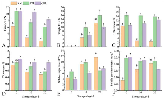 Changes in quality parameters among three plum cultivars during storage at room temperature. (A), Firmness; (B), weight loss; (C), TSS content; (D), TA content; (E), soluble sugar content; (F), soluble protein content. Note: vertical bars express the standard errors of the means (n = 3). Different lowercase letters indicate significant differences for each storage period (p < 0.05).