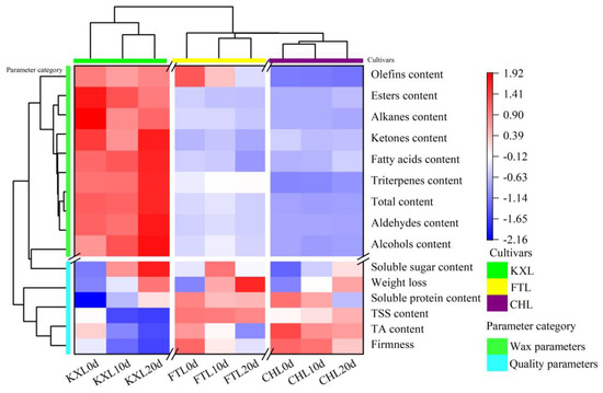 Cluster analysis of wax composition and fruit quality among three plum cultivars during storage at room temperature. Note: the color ranges from blue to red indicates low to high correlation coefficients.