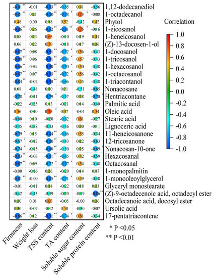 The joint analysis of wax parameters and quality parameters revealed that the firmness of plum fruit was negatively correlated with wax parameters and was significantly negatively correlated with alcohols, triterpenes, aldehydes, fatty acids and total content (p < 0.01) and negatively correlated with alkanes, ketones and esters (p < 0.05). The weight loss of plum fruit was negatively correlated with wax parameters except triterpenes, alcohols and aldehydes, but the correlation was weak. The TSS content of plum fruit was significantly negatively correlated with wax components, alcohol and fatty acid contents (p < 0.01) and negatively with ketones, aldehydes, esters, triterpenes and total contents (p < 0.05). The TA content of plum fruit was negatively correlated with wax parameters and mainly negatively correlated with alcohol, aldehyde, triterpenes and total content (p < 0.05). The soluble sugar content of plum fruit was positively correlated with all wax composition, but the correlation was weak. The soluble protein content of plum fruit was negatively correlated with wax parameters and mainly negatively correlated with alkanes and esters (p < 0.05).