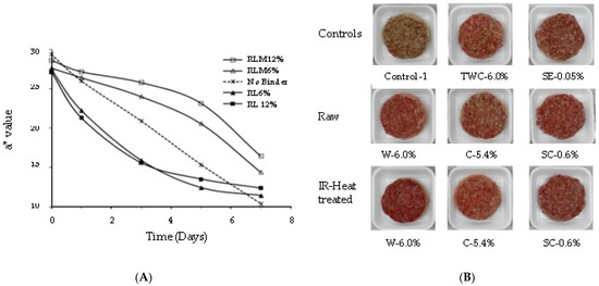 One of the most unique functionality benefits of incorporating lentil flour from IR-heated lentils was the improvement of color stability of fresh beef products during storage. Der [16] evaluated the color as the CIE color of uncooked beef burgers incorporating 6 and 12% (by weight) IR-treated dehulled lentil flour (15% MC: 135 °C) and non-IR-treated flour from dehulled green and red lentils as a binder to low-fat (10%) beef burgers stored at 4 °C (Figure 4A). Overall, redness (a*) decreased for all uncooked burgers during the 7 days of retail display (4 °C); however, the rate of redness reduction was slower when IR-treated lentil flour was incorporated. On day seven, the a* value of the uncooked burgers formulated with 12% IR-treated green lentils reached 17.4. The corresponding values of the burgers with non-IR-treated lentils (12%) and no-binder control were 11.04 and 10.4, respectively, showing a significant positive effect from IR treatment on red color retention. This prolonged redness retention after production could prove useful to decrease product loss at retail or at the consumer level. It is noteworthy that in the same study, a more rapid discoloration occurred with the addition of unheated lentil flour to low-fat beef burgers (Figure 4A). Other studies have also reported the improved color stability of uncooked low-fat beef burgers formulated with IR-treated lentil flour [18,118]. Burgers containing 6% IR-treated whole lentil flour had a significantly higher a* value (16.0) in comparison with the burgers with the same amount of untreated lentil flour (11.9) and no binder (9.7) formulations [117] on the fourth day in retail display at 4 °C. Similarly, Li [18] reported a lower magnitude of decrease in the a* value (10.7 vs. 15.8) from day 0 to day 3 (4 °C storage) in uncooked beef burgers formulated with 6% IR-treated and untreated whole lentil flour. These findings confirmed that formulating uncooked meat products with IR-treated lentil flour rather than untreated lentil flour would be especially important for extending raw color stability.
