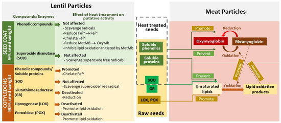 Among the antioxidant compounds found in pulses, phenolic compounds have a significant role in delaying the oxidative degradation of meat products. Due to their redox characteristics, phenolic compounds are capable of functioning as hydrogen donors, reducing agents, and singlet oxygen quenchers [55], thereby controlling lipid, color, and flavor oxidation. Flavonoids, tannins, and phenolic acids make up the majority of the polyphenolic compounds found in pulses. Both the cotyledon and the seed coat have phenolic compounds which are found in higher concentrations in the latter [18]. The color of the seed coat is linked to the types of phenolic compounds of pulse seeds, whereby dark-colored seed coats have higher phenolic contents than light-colored pulses [56,57]. With respect to lentils, the green seed coats have higher levels of water-soluble phenolics compared with grey and brown [58].
