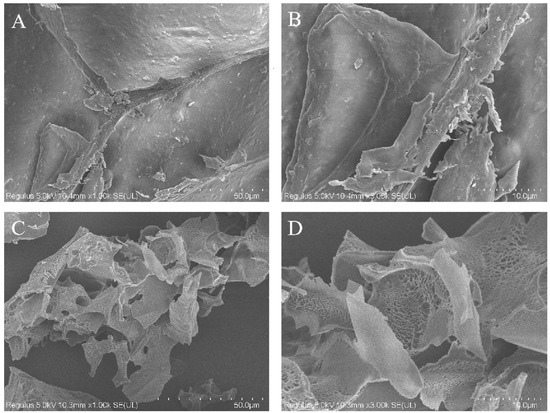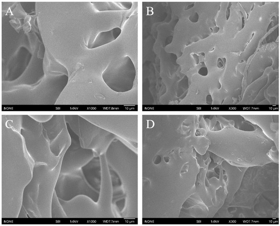 SEM micrographs of jelly added U-SDF ((A): ×1000 magnification; (B): ×300 magnification and jelly added M-SDF (C): ×1000 magnification; (D): ×300 magnification).